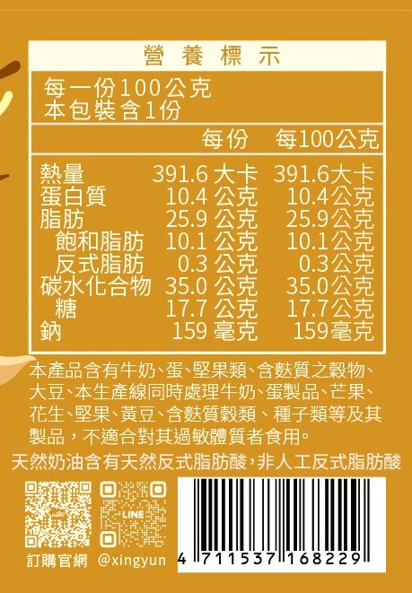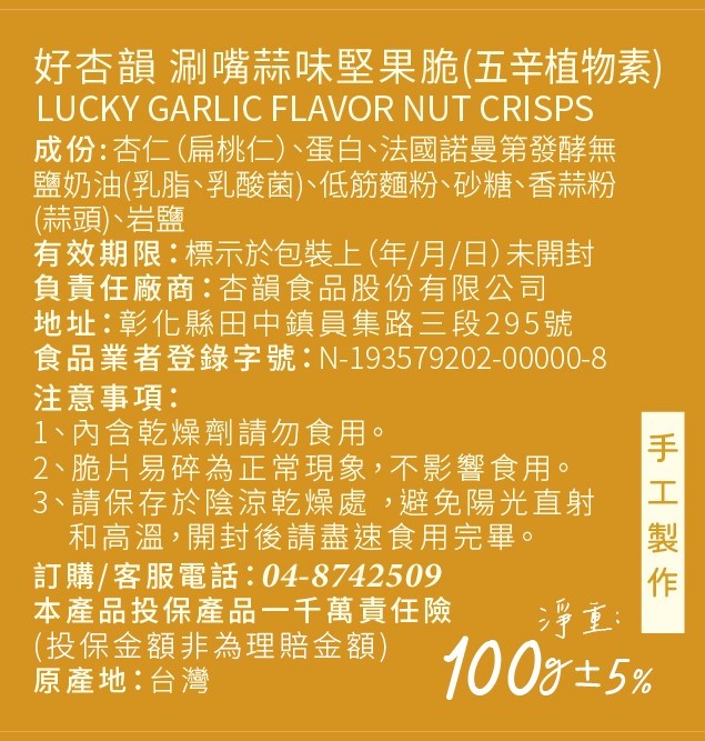 成分:加州杏仁(扁桃仁)、蛋白、法國無鹽發酵奶油(乳脂、乳酸菌)、小麥麵粉、砂糖、香蒜粉(蒜頭)、岩鹽